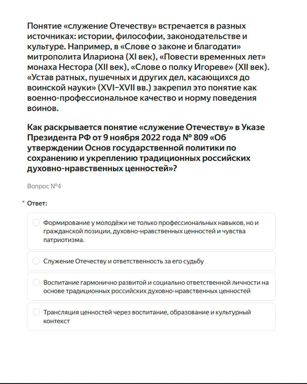 A separate block of questions is devoted to Putin. Students must identify the stated goal of the “special military operation” announced on February 24, 2022, explain what is meant by “service to the Fatherland,” and name a project launched in 2026.