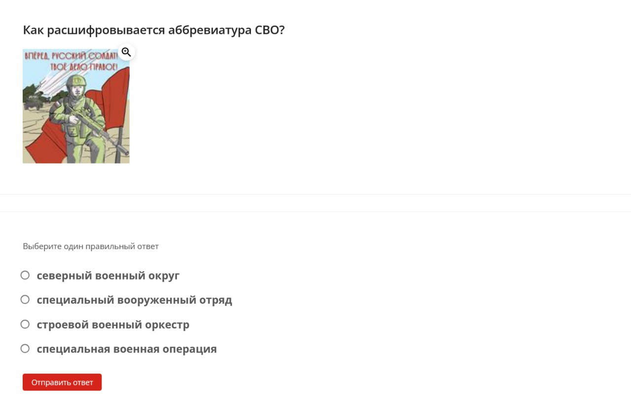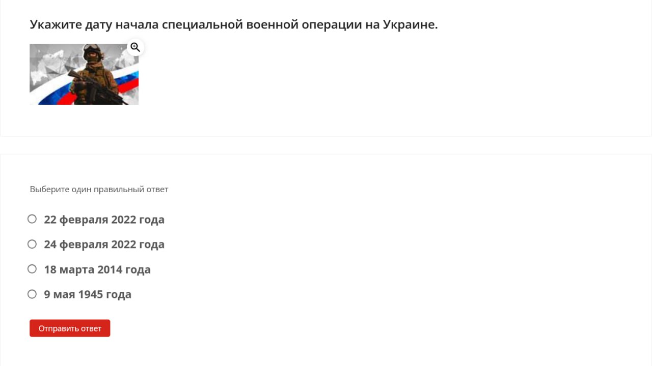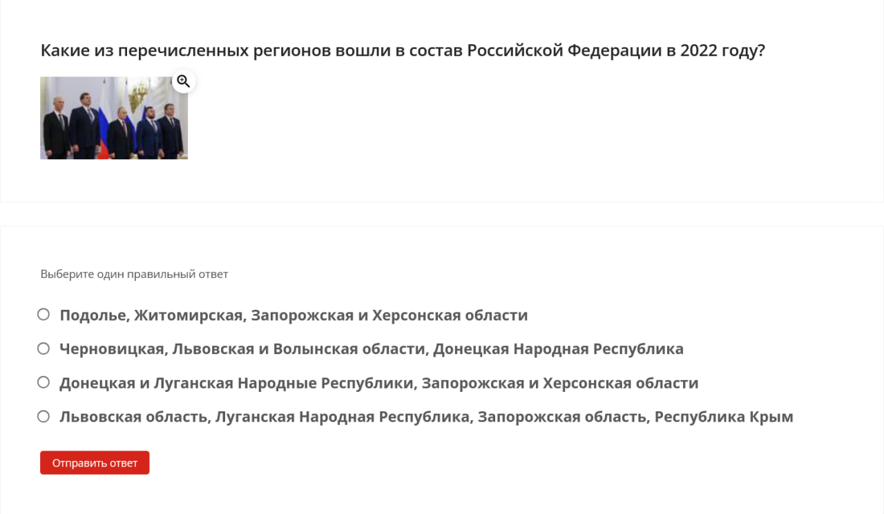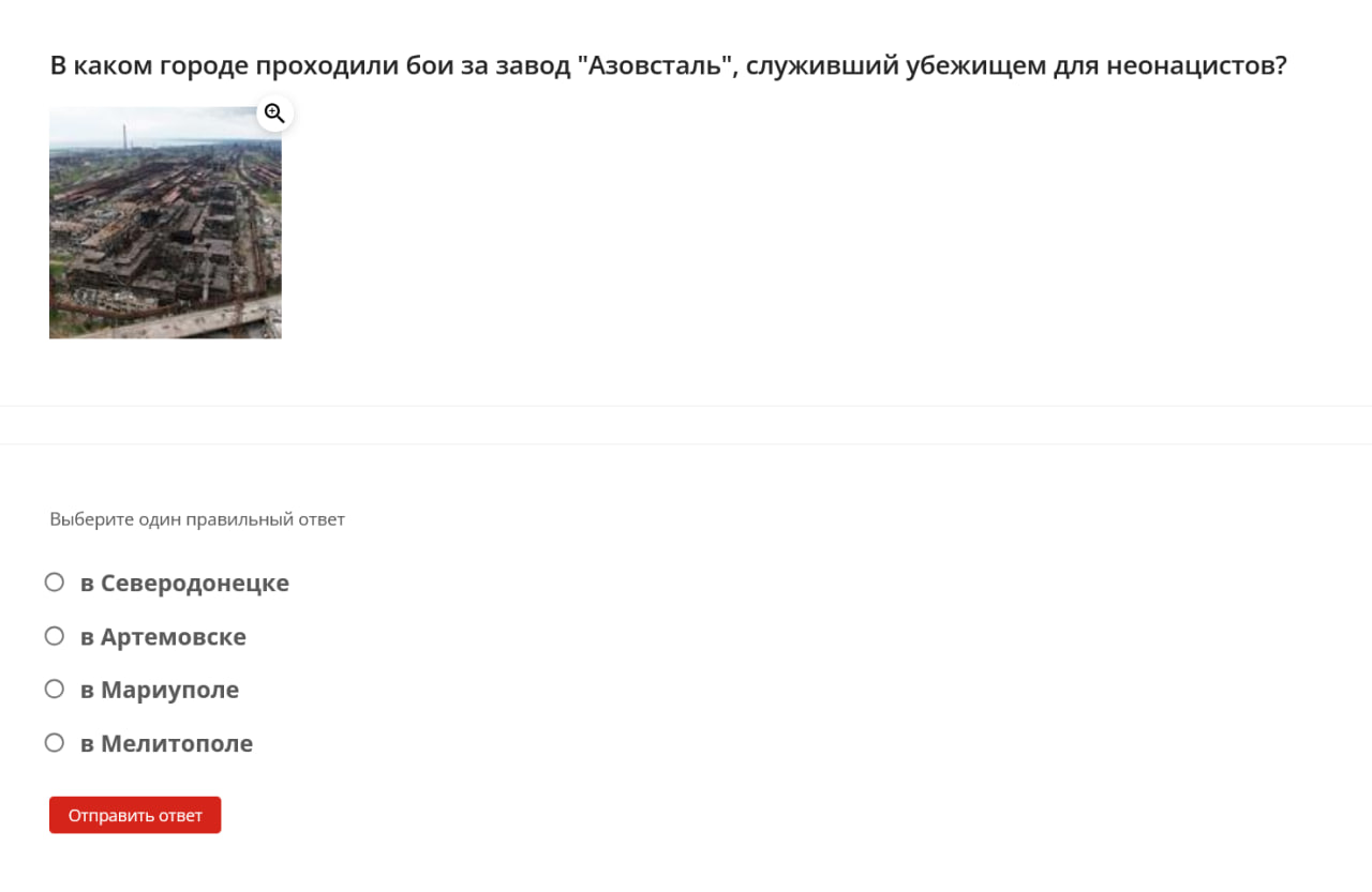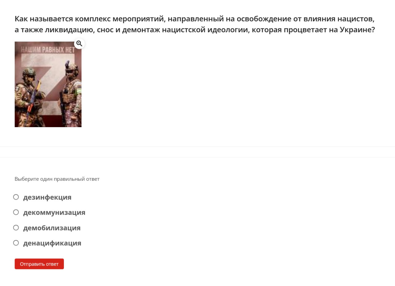 Here are some examples of questions students were asked: define the term “denazification,” name the date when the “special military operation” began, identify the Donetsk memorial dedicated to “children killed by neo-Nazi aggression against civilians,” name the coat of arms of one of the occupied territories of Ukraine.