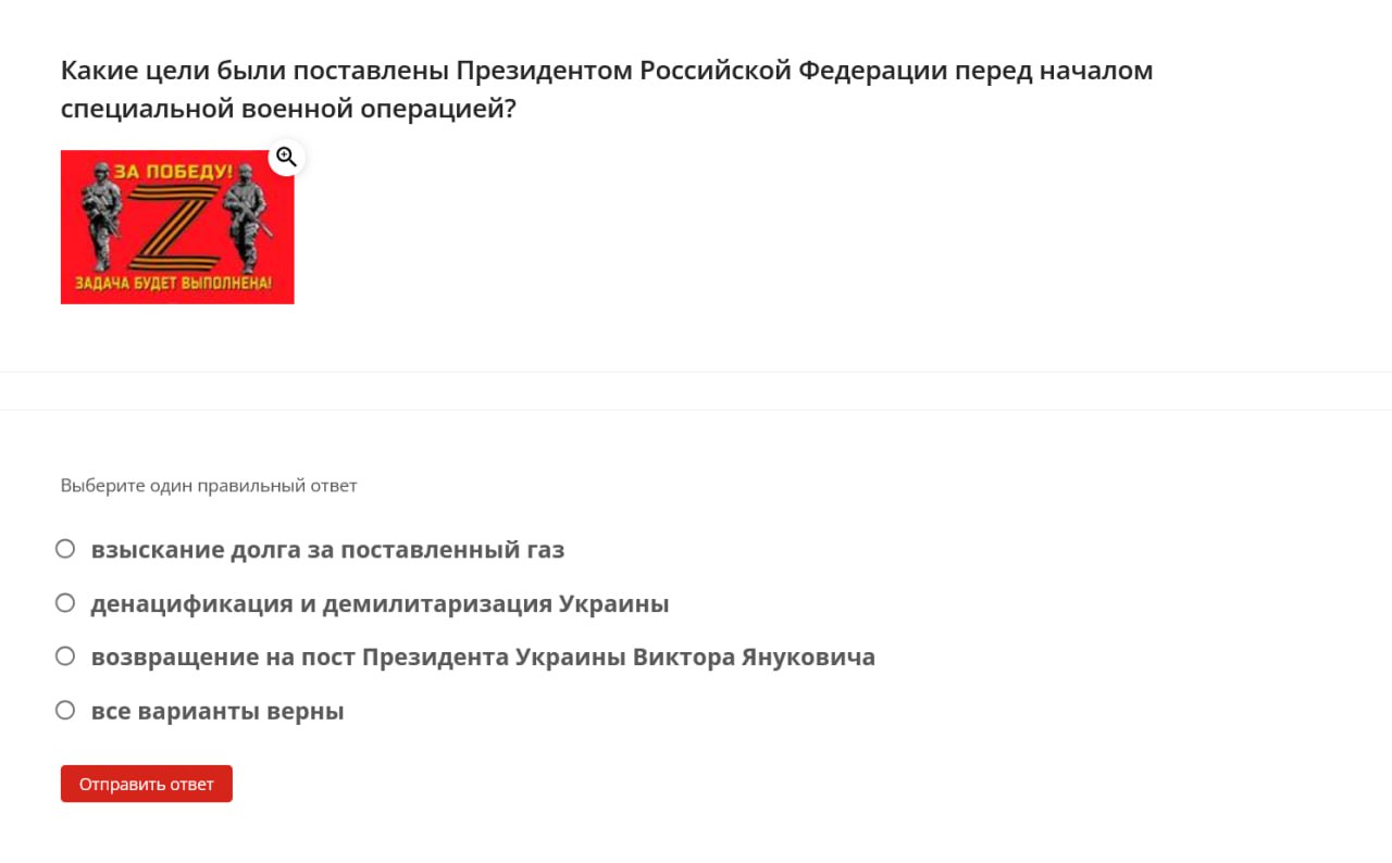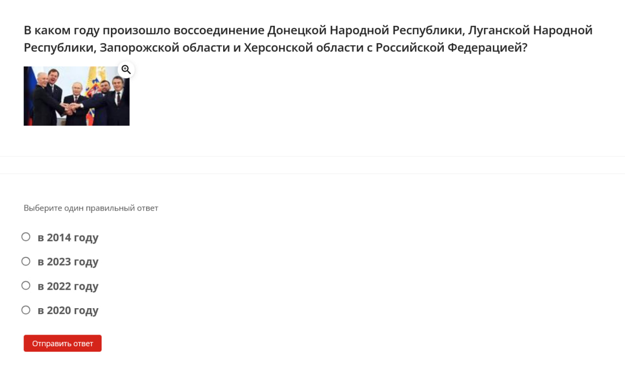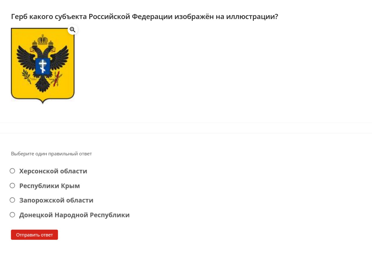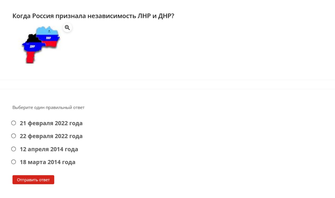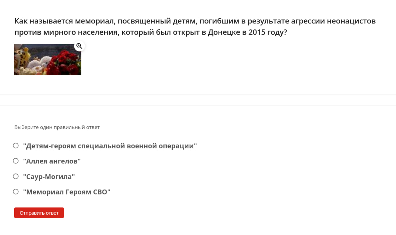 Here are some examples of questions students were asked: define the term “denazification,” name the date when the “special military operation” began, identify the Donetsk memorial dedicated to “children killed by neo-Nazi aggression against civilians,” name the coat of arms of one of the occupied territories of Ukraine.