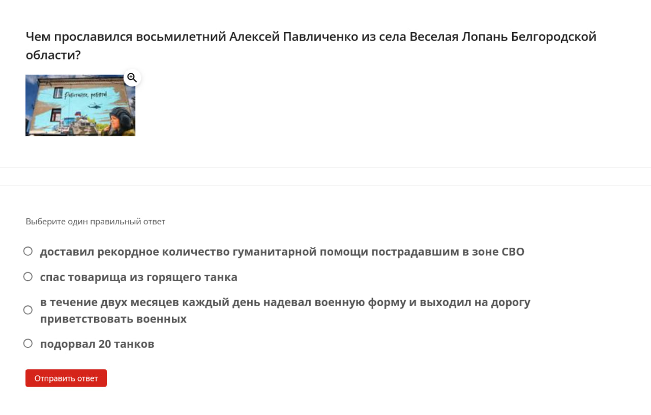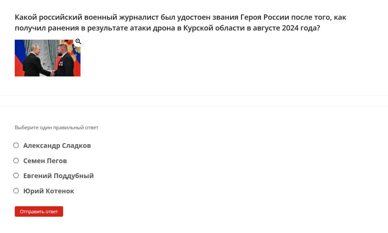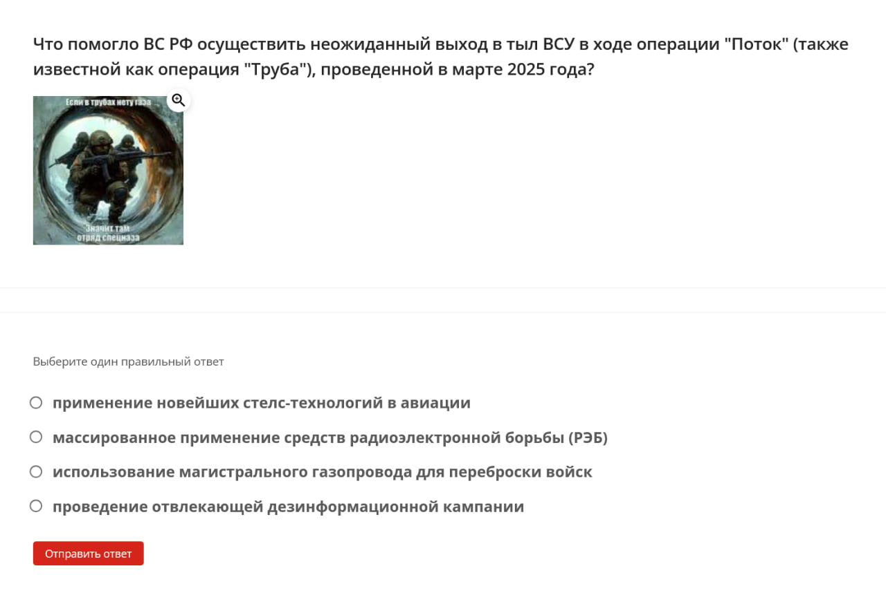 Some questions are illustrated with memes and propaganda slogans. For example, the question about Operation 'Potok' / 'Truba' (related to an alleged Ukrainian incursion into the Kursk region) is accompanied by a poster reading: “If there’s no gas in the pipes — it means there’s a special forces unit inside.”