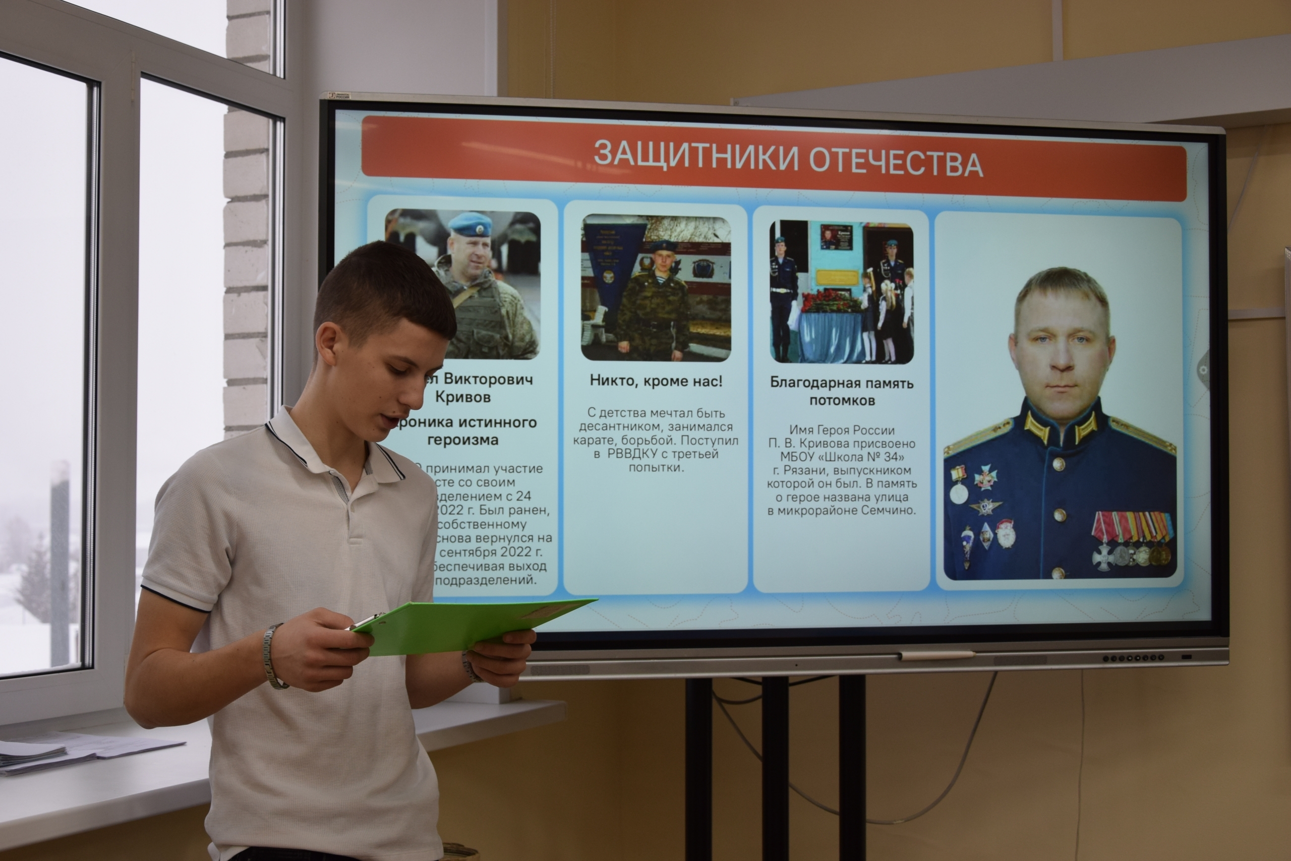 At the end of the lesson, students were invited to take part in the campaign “Our Defenders of the Fatherland” and were shown a video featuring “SMO participants” reflecting on heroism. Special attention in the video was given to the “Portrait of a Hero” campaign, which, according to organizers, involved 20,000 participants and is described as “a living dialogue and thousands of stories of courage and bravery.”