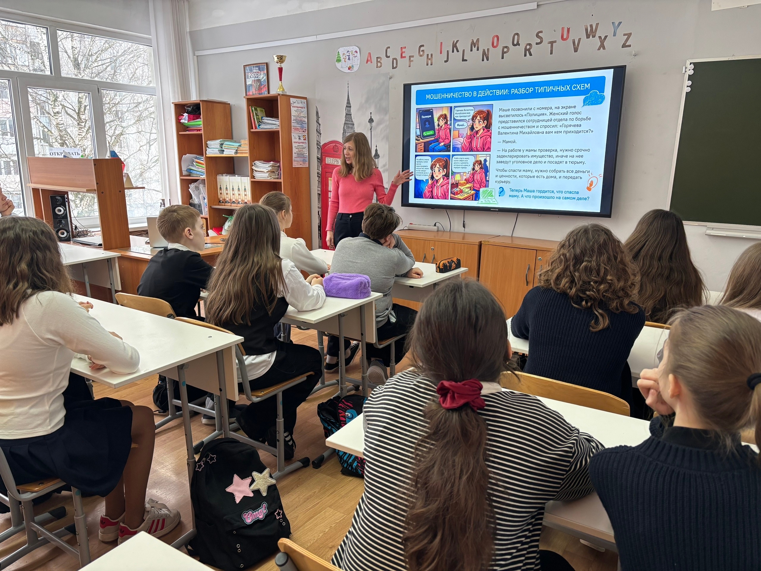 Школьников убеждали, что мошенники в интернете «охотятся именно на подростков», и многие становятся соучастниками преступлений. В качестве примера детям рассказали историю 18-летнего юноши, которого обманули мошенники и теперь ему грозит до 20 лет по статье «Террористический акт».