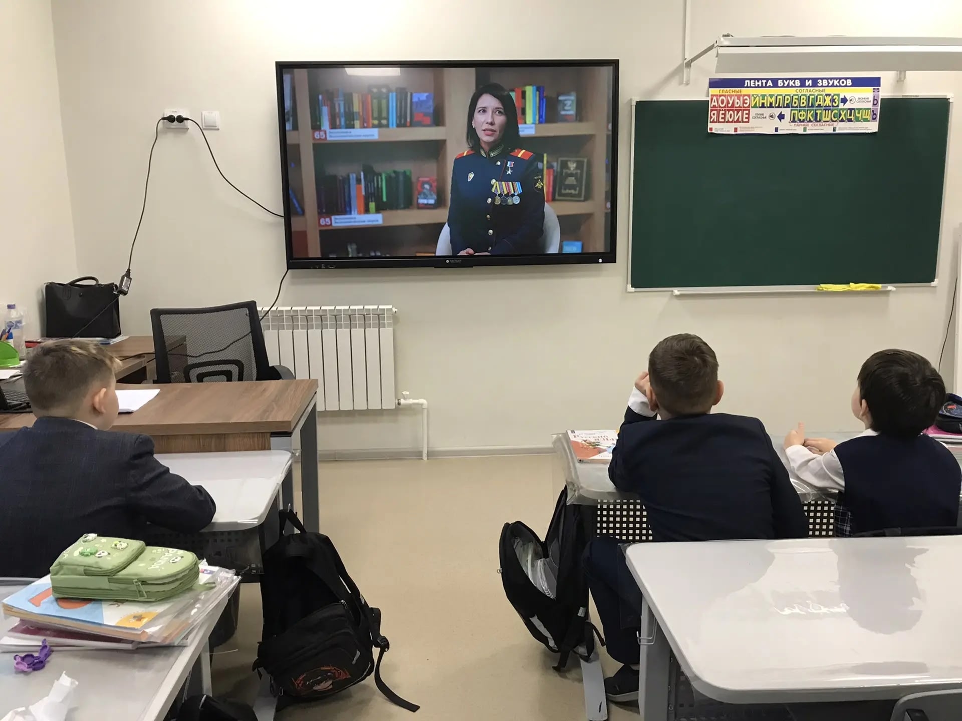 Детям также показали интервью с медсестрой и участницей «СВО» Людмилой Болилай, которая на фронте якобы спасла жизнь раненому военному, закрыв его своим телом во время обстрела. В интервью женщина рассказала, что, не смотря телевизор, она поняла, что «идёт война», и отправилась в военкомат.