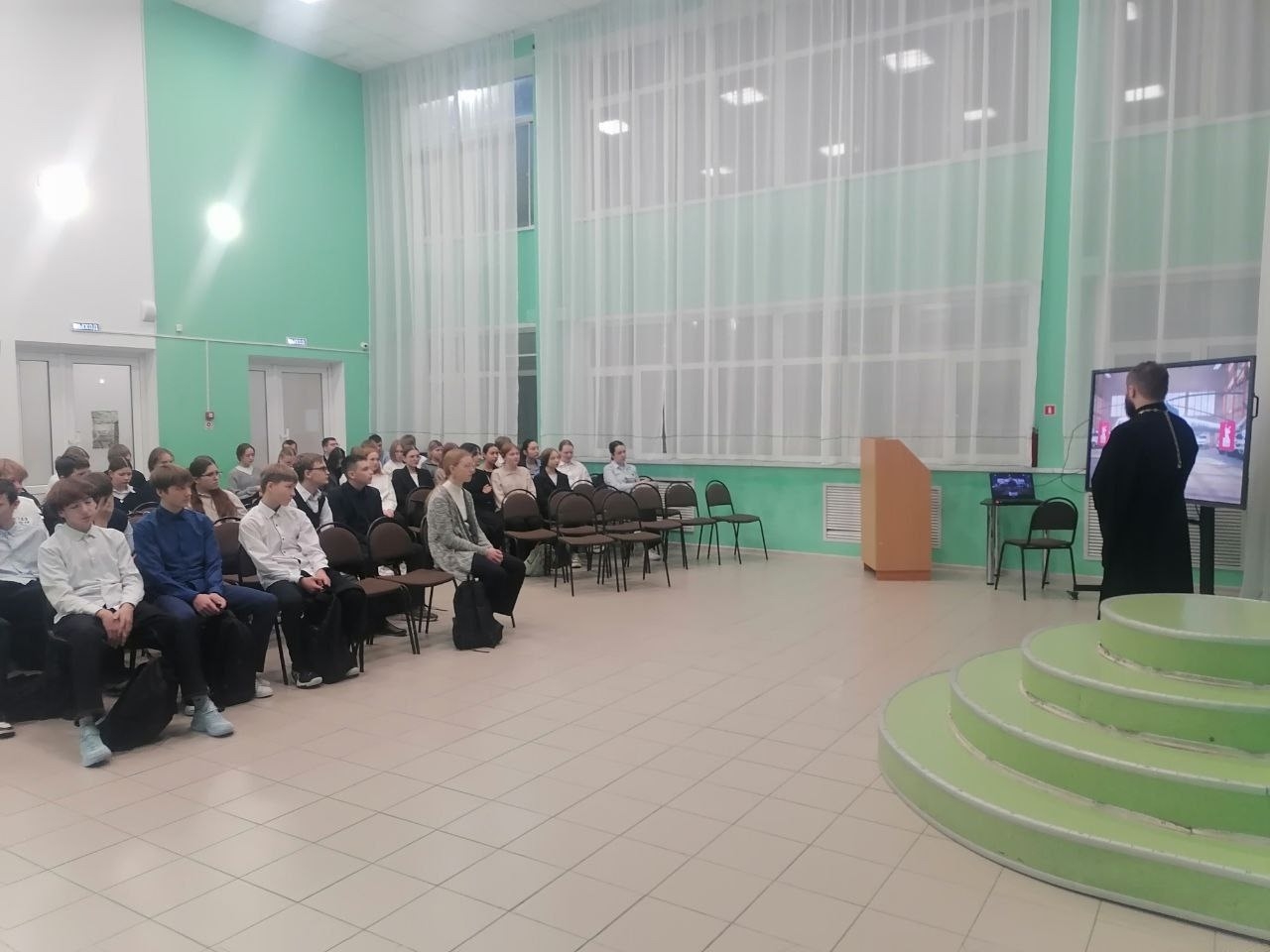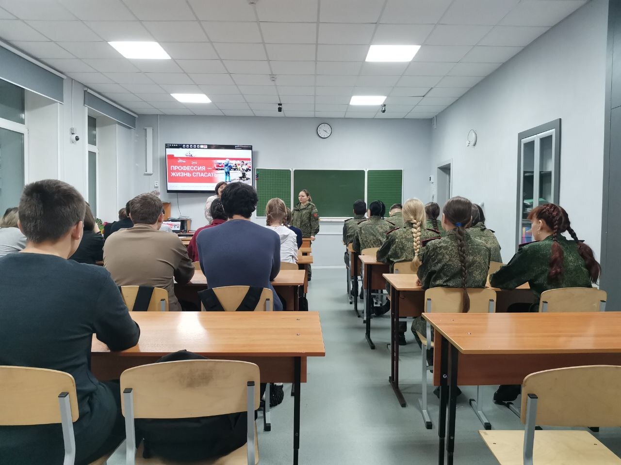 В завершение занятия школьникам показали рекламный фрагмент о вузах, где готовят спасателей, и предложили «связать свою жизнь со службой». В качестве первой ступени к профессии спасателя школьникам порекомендовали сдать ГТО.